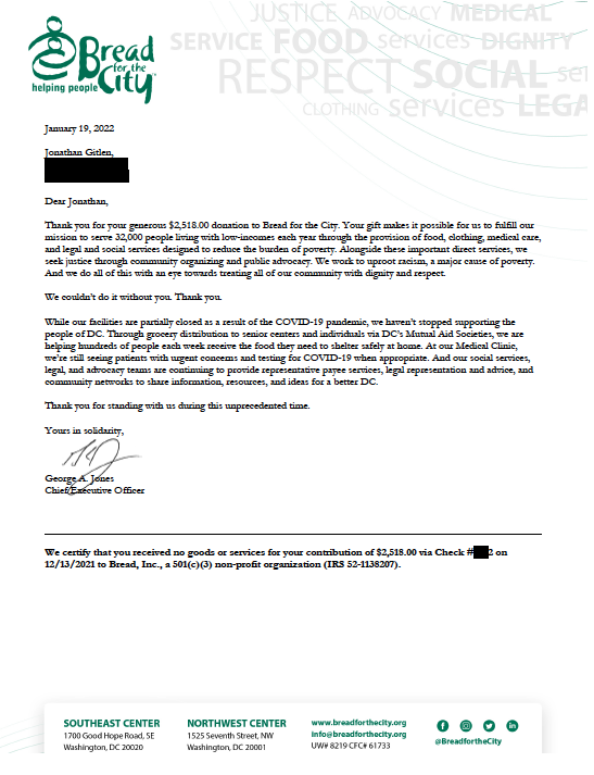 Mr. Coley and I agreed that the money raised for him by strangers through the GoFundMe Campaign should be paid forward. I consequently made a donation on our behalf in the total amount of money raised by the GoFundMe contributors to Bread for the City.